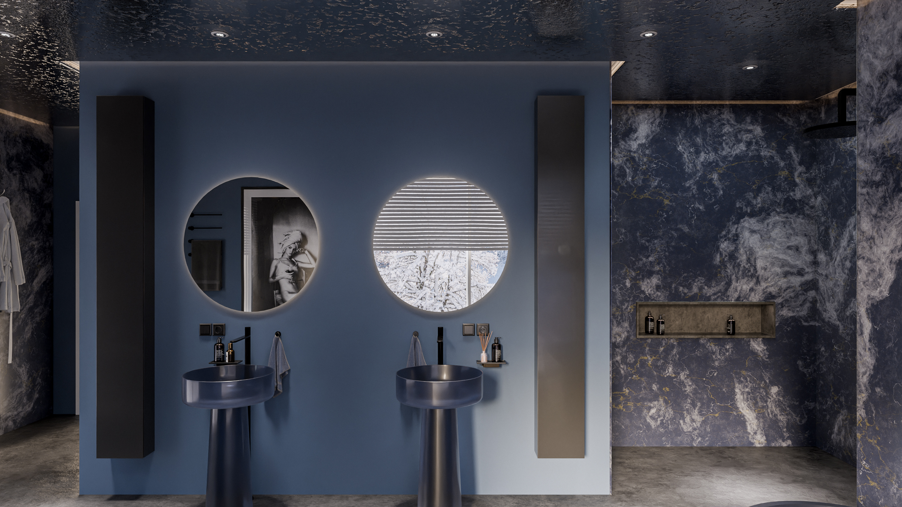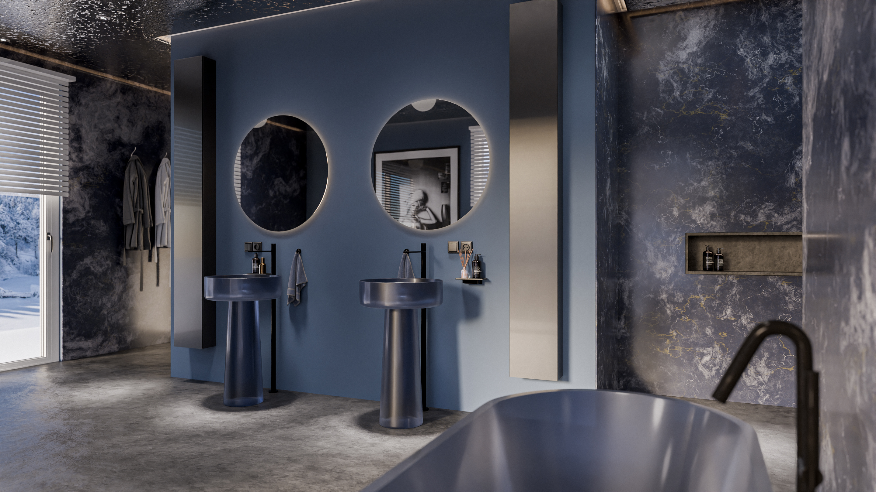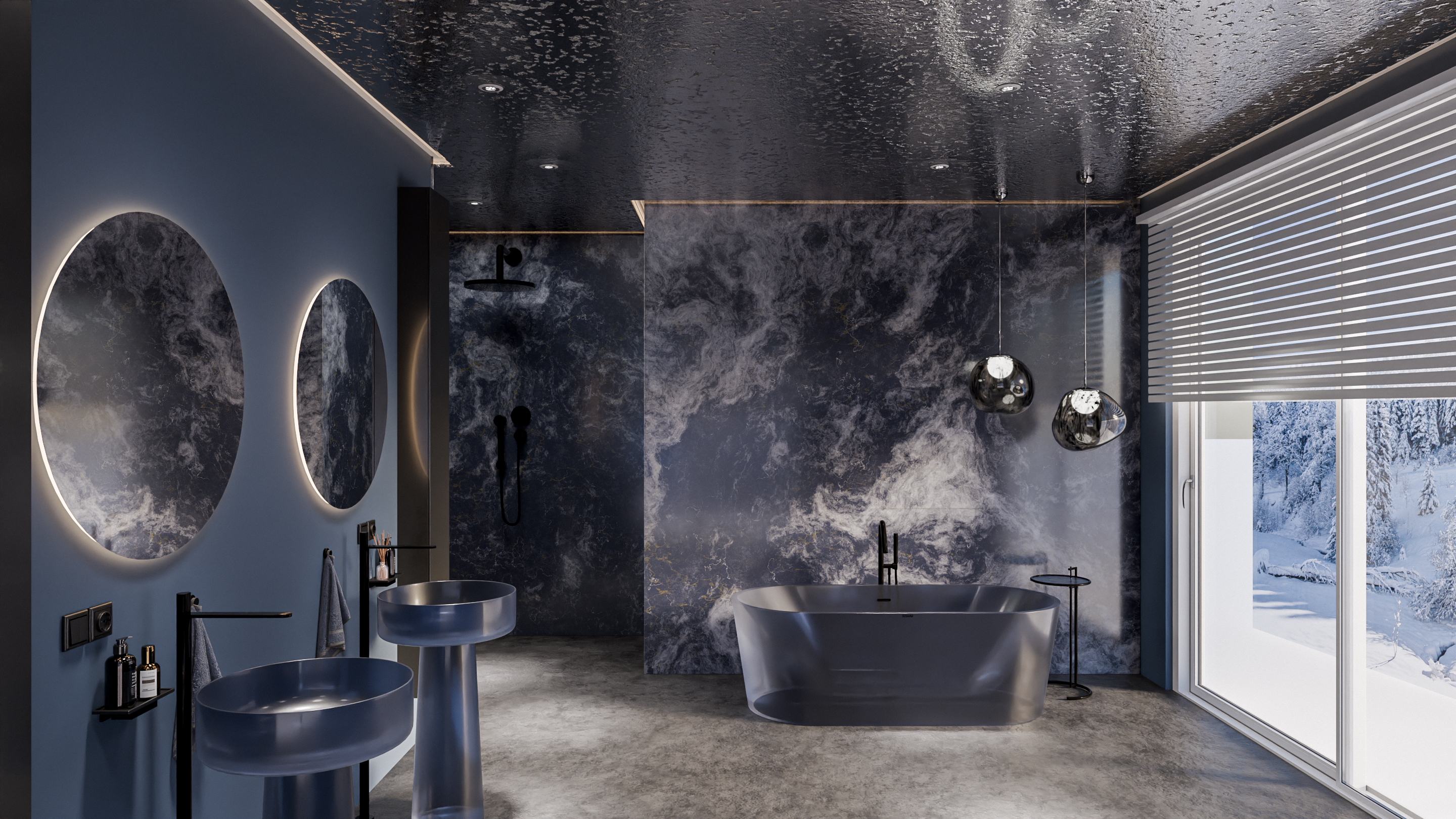 Der Badezimmerentwurf präsentiert sich in einem modernen und naturverbundenen Design. Als Inspiration dienten beeindruckenden isländische Gletscherhöhlen.