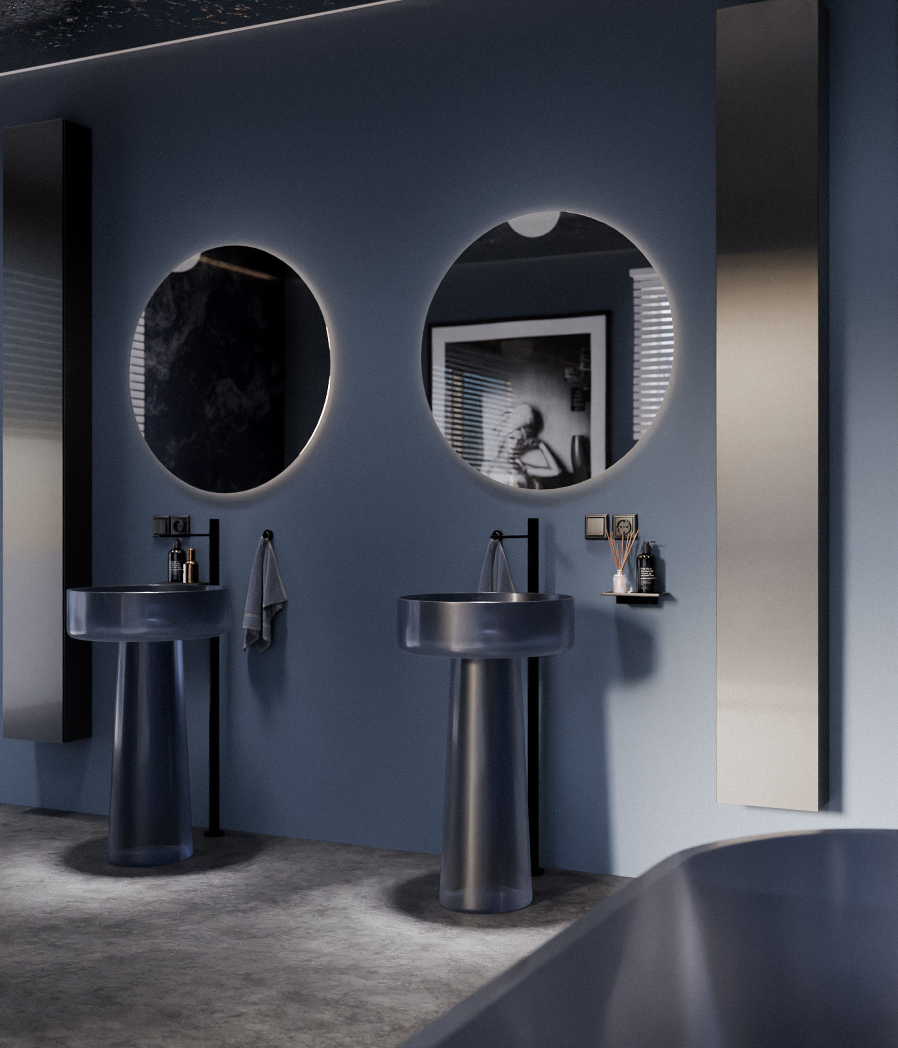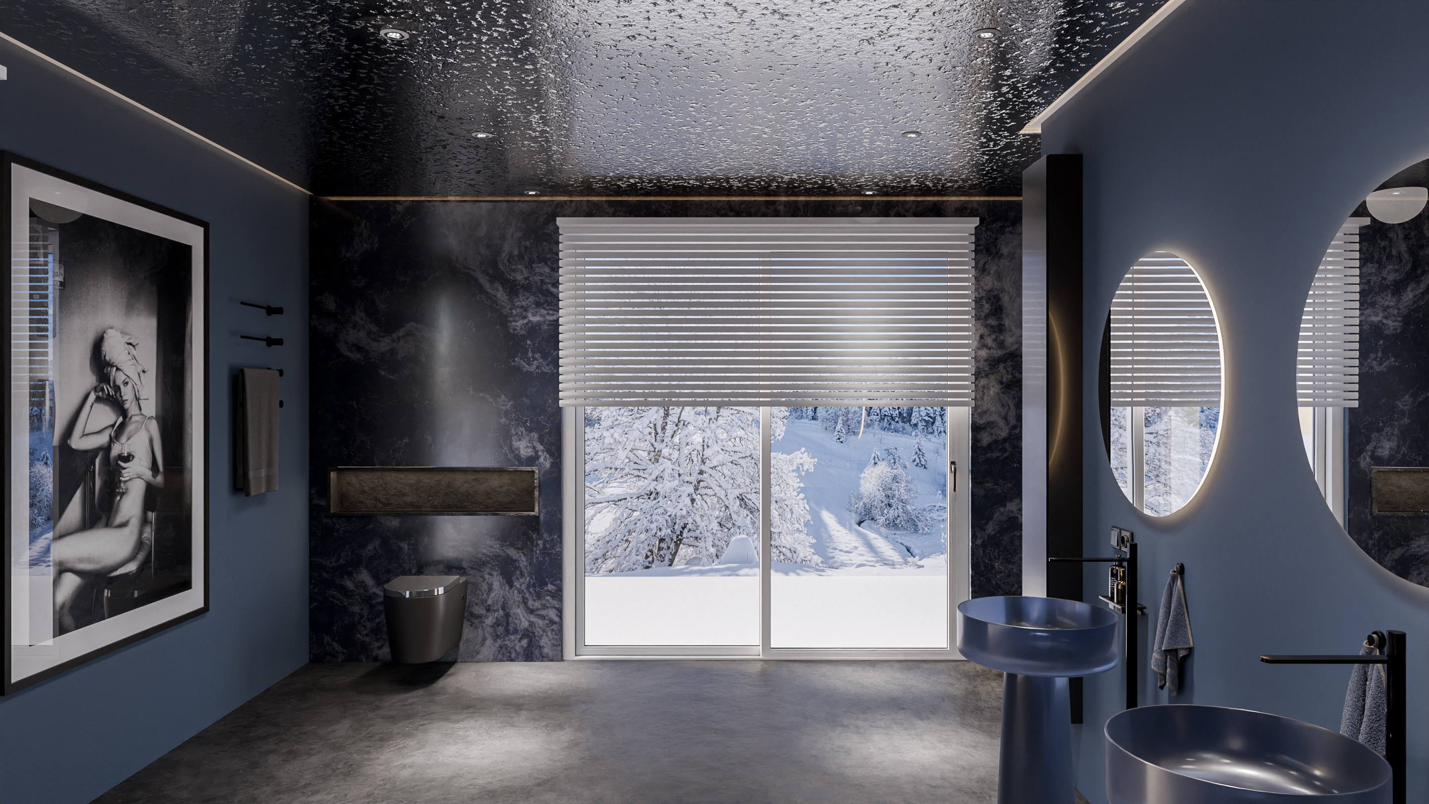 Die ausgewählten Farben und Materialien schaffen eine stimmungsvolle, dunkle Atmosphäre, während Leuchten von TomDixon und metallische Deckenverkleidungen das Ambiente von gefrorenem Eis widerspiegeln. Das innovative Cristalmood-Material verleiht der Badewanne und den Waschbecken eine einzigartige Transparenz und einen faszinierenden Glanz.