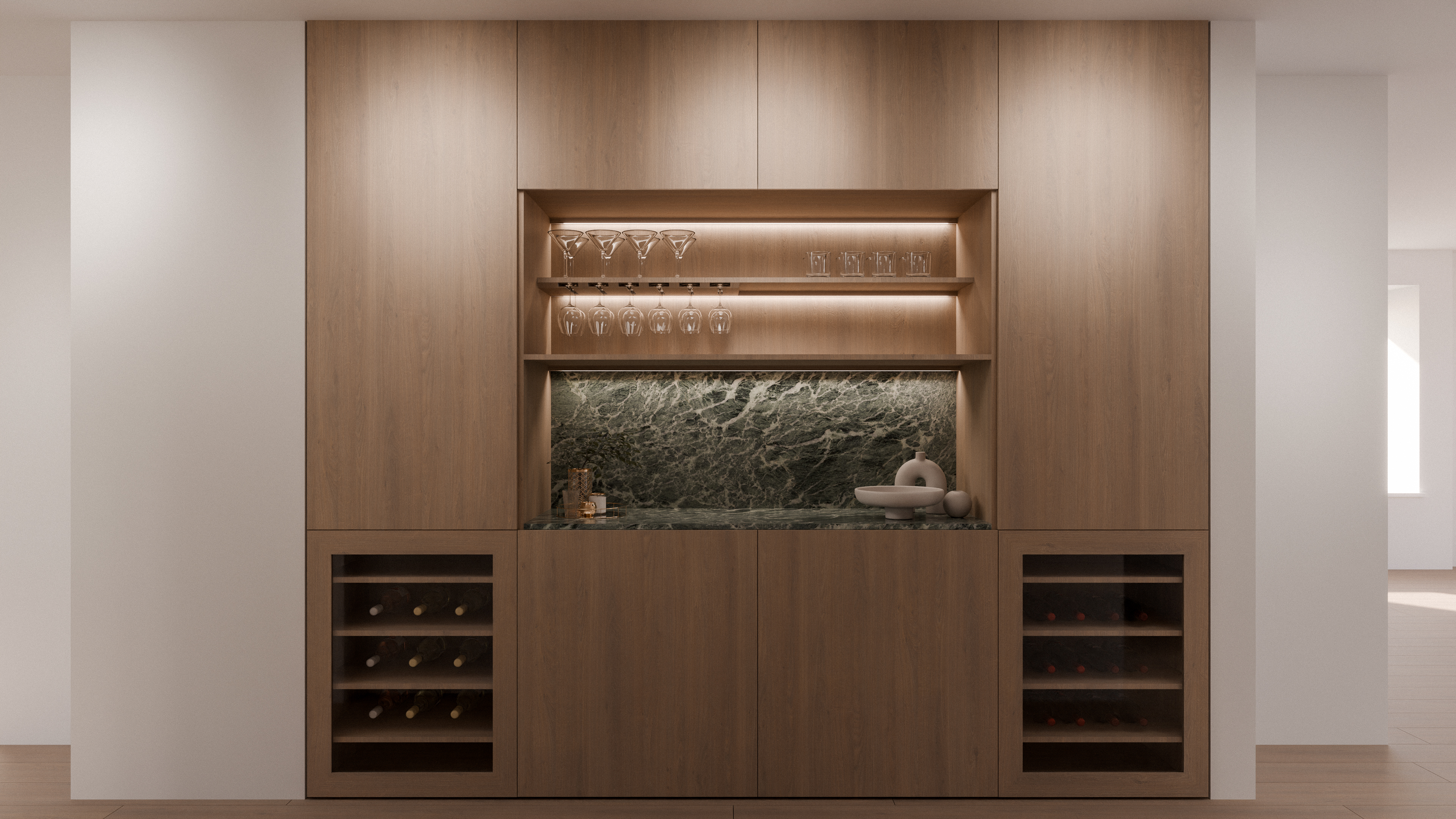 Im Designprozess standen die gemeinsam mit dem Kunden definierten Schlagworte "naturverbunden, beeindruckend, stimmungsvoll dunkel und luxuriös" im Mittelpunkt. Inspiriert von der faszinierenden Welt isländischer Gletscherhöhlen wurde ein Raumkonzept entwickelt, das diese Qualitäten in einer atmosphärischen und modernen Gestaltung vereint.