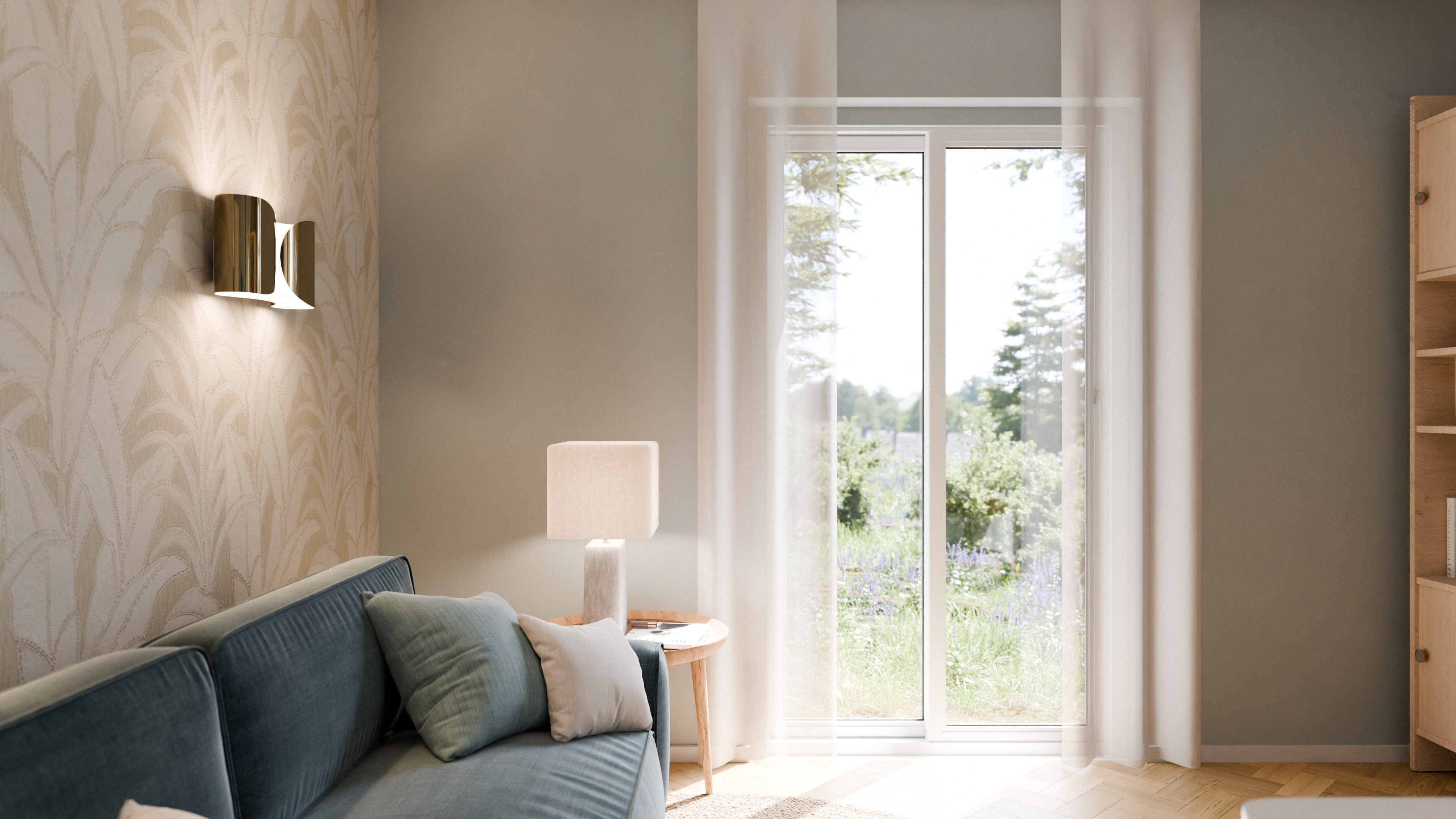 Zentrale Elemente wie die maßgefertigte Regalwand strukturieren den Raum funktional und ästhetisch: Sie bietet großzügigen Stauraum und integriert Technik und Arbeitsmaterialien, ohne visuelle Unruhe zu erzeugen. Als ruhiger Gegenpol dazu wirkt die Akzentwand hinter dem Sofa – mit einer fein strukturierten Tapete im Blattmotiv, die dem Raum eine leise, tropisch angehauchte Note verleiht und gleichzeitig Ton-in-Ton bleibt. Textile Komponenten tragen wesentlich zur Behaglichkeit bei: bodentiefe, leichte Vorhänge filtern das Tageslicht weich, der Jute-Teppich bringt Natürlichkeit und Erdung in die Komposition (ergänzt durch einen hellen, weichen Teppichläufer für zusätzliche Gemütlichkeit). Das Samtsofa setzt mit seiner satten, gedeckten Farbigkeit einen ruhigen Fokus im Raum.