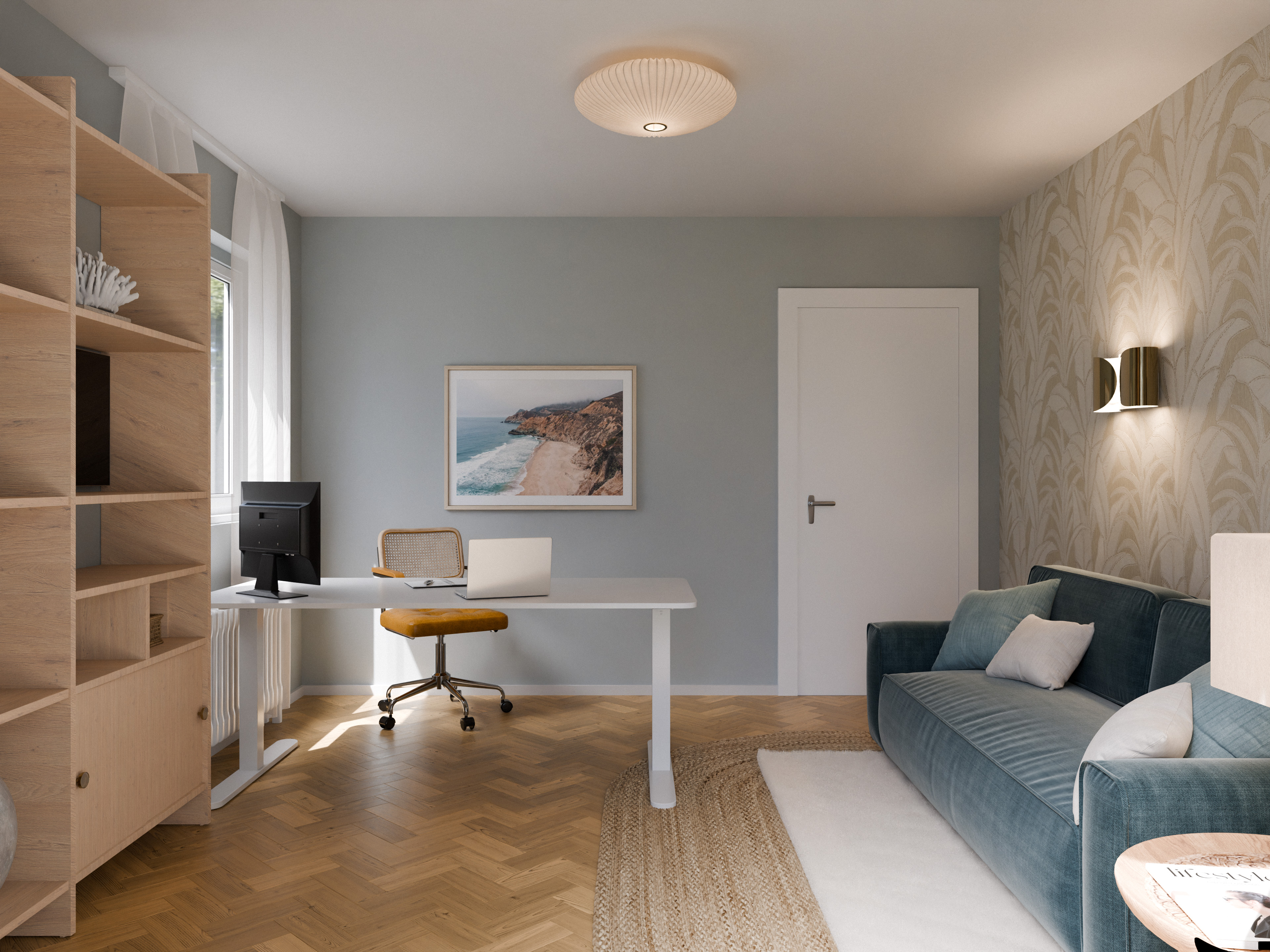 Das Gestaltungskonzept dieses Home Offices vereint Funktionalität mit Ruhe und einer Atmosphäre zum Durchatmen. Ziel war es, einen Ort zu schaffen, der konzentriertes Arbeiten ermöglicht und zugleich Rückzug, Regeneration und kreative Pausen zulässt. Die helle, luftige Grundstimmung ist inspiriert von der Weite des Meeres, der sanften Brise Südostasiens und der natürlichen Gelassenheit von Küstenlandschaften. Sanfte Beigetöne bilden das Fundament, ergänzt durch subtile Blau- und Petrolnuancen, die an Himmel und Wasser erinnern und dem Raum Tiefe verleihen, ohne ihn zu beschweren.