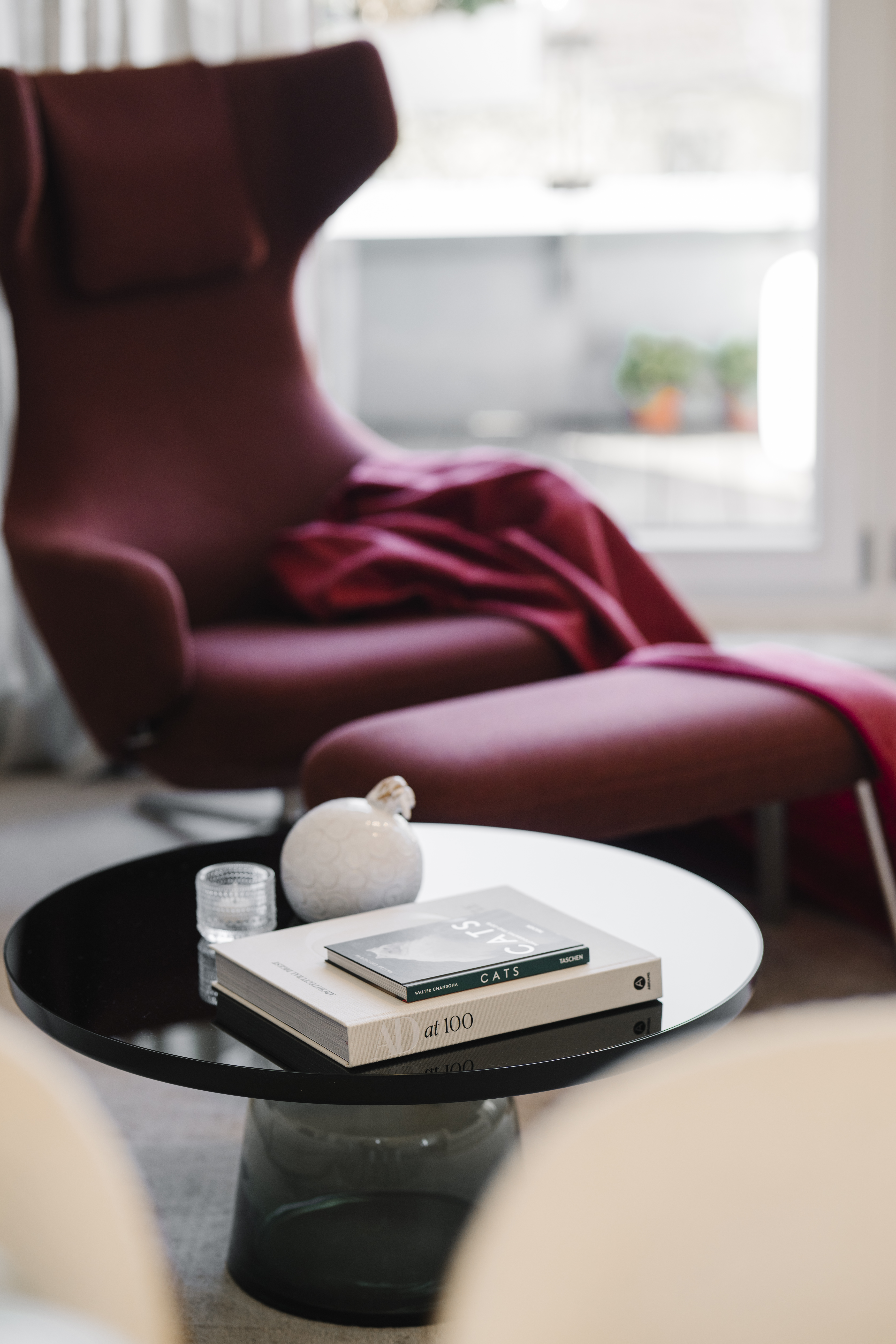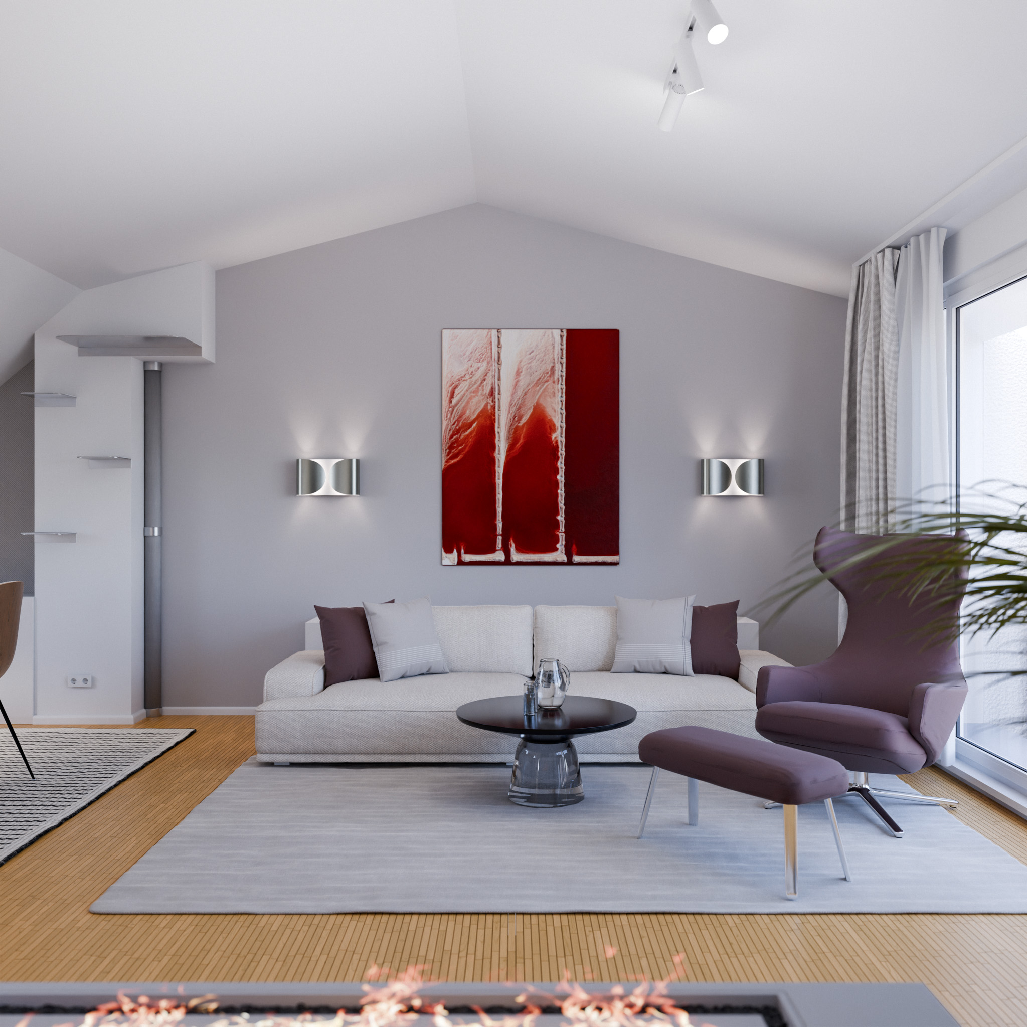 Eine der zentralen Herausforderungen dieses Interior Designs lag in der harmonischen Integration starker Farbakzente in einem sonst dezent gehaltenen Farbschema. Die intensiven Rottöne rund um den Vitra-Sessel und die Kunstwerke sollten gezielt Akzente setzen, ohne die ruhige, elegante Grundstimmung des Raumes zu stören – eine Balance, die viel Fingerspitzengefühl im Zusammenspiel von Materialien, Licht und Proportionen erforderte.
