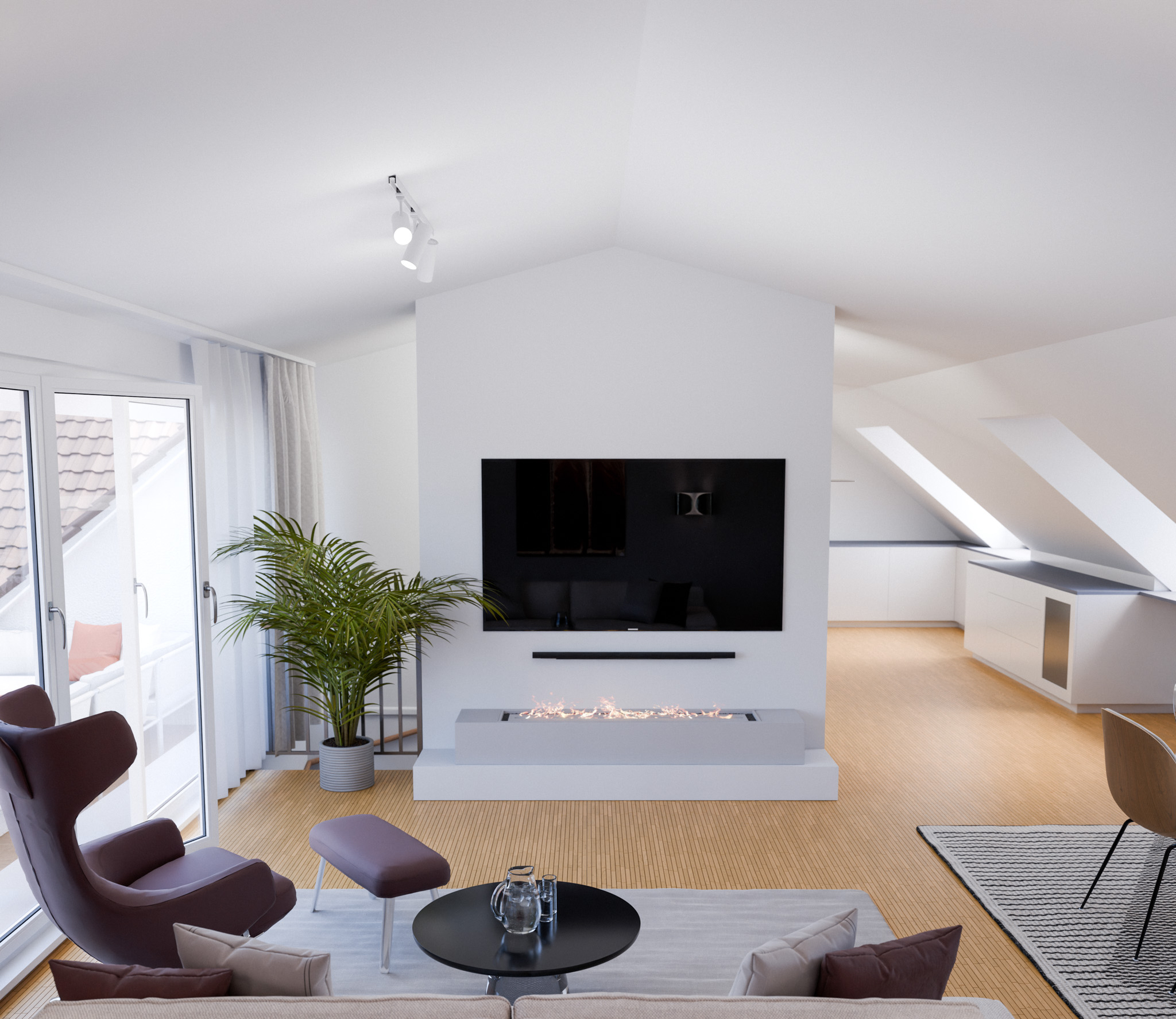 Besonders persönlich wird es mit dem eigens vom Kunden entworfenen Wasserdampfkamin, der geschickt in das Interior eingebunden wurde und nun als minimalistisches Designobjekt wirkt.