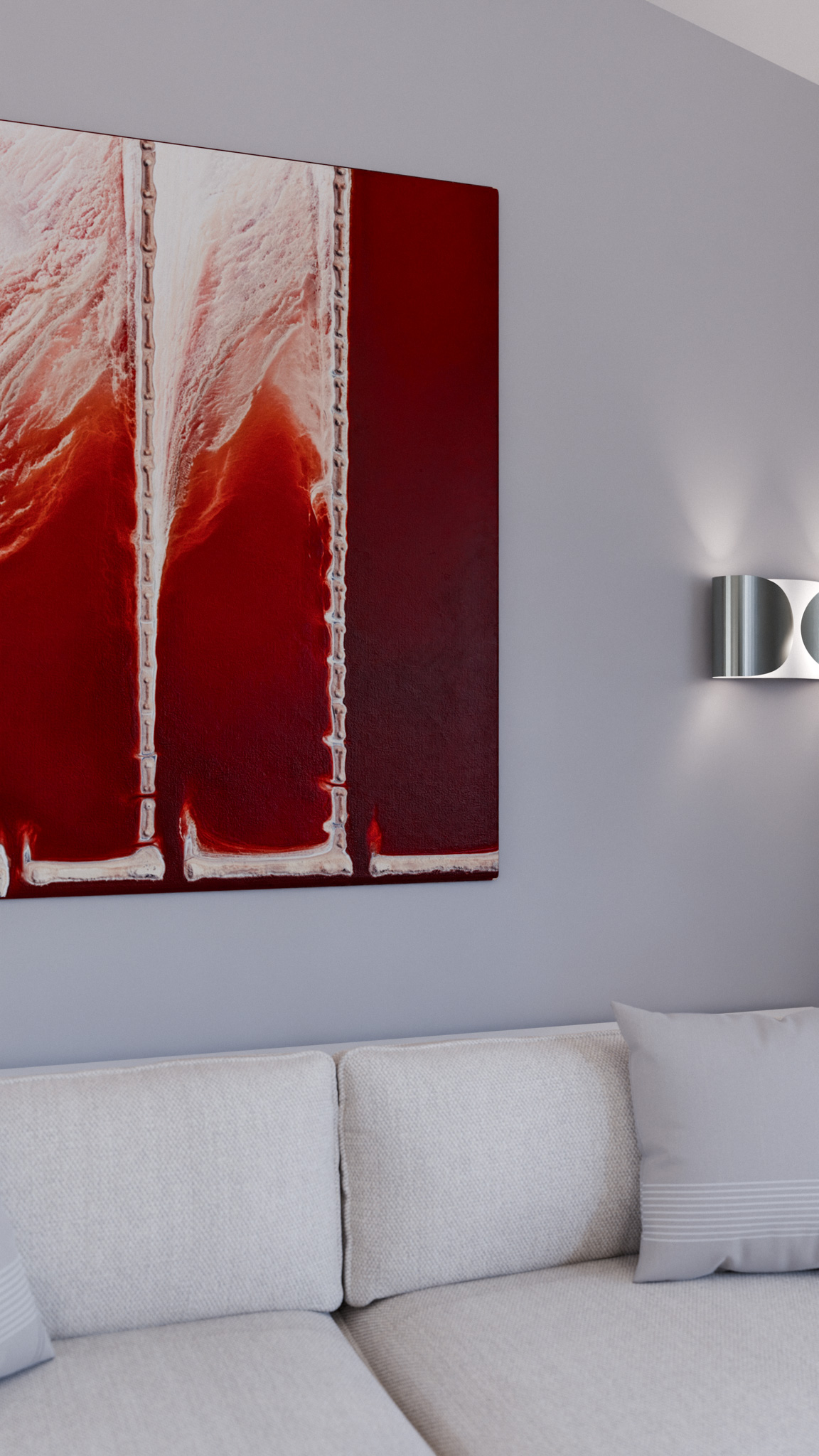 Ein echtes Statement-Piece ist die großformatige Fotografie „Salt Shapes“ des Künstlers Kevin Krautgartner. Aus dem Flugzeug aufgenommen, zeigen die Bilder von Salinenflächen nicht nur beeindruckende Farbverläufe, sondern wirken beinahe wie abstrakte Gemälde – perfekt in Szene gesetzt auf der Hauptwand des Wohnzimmers.