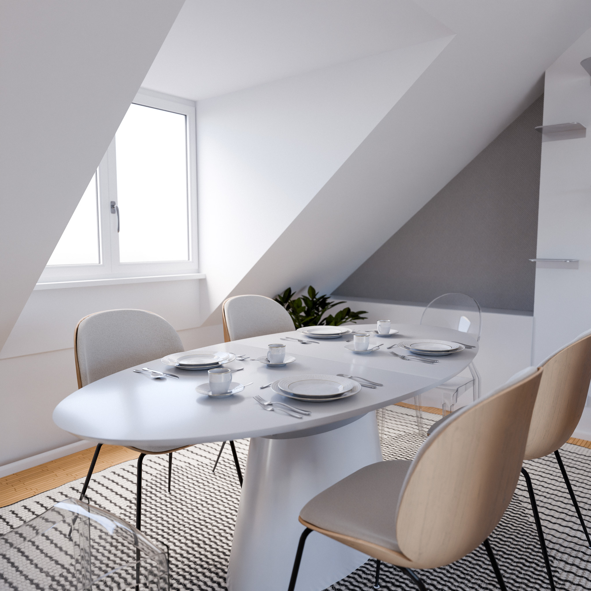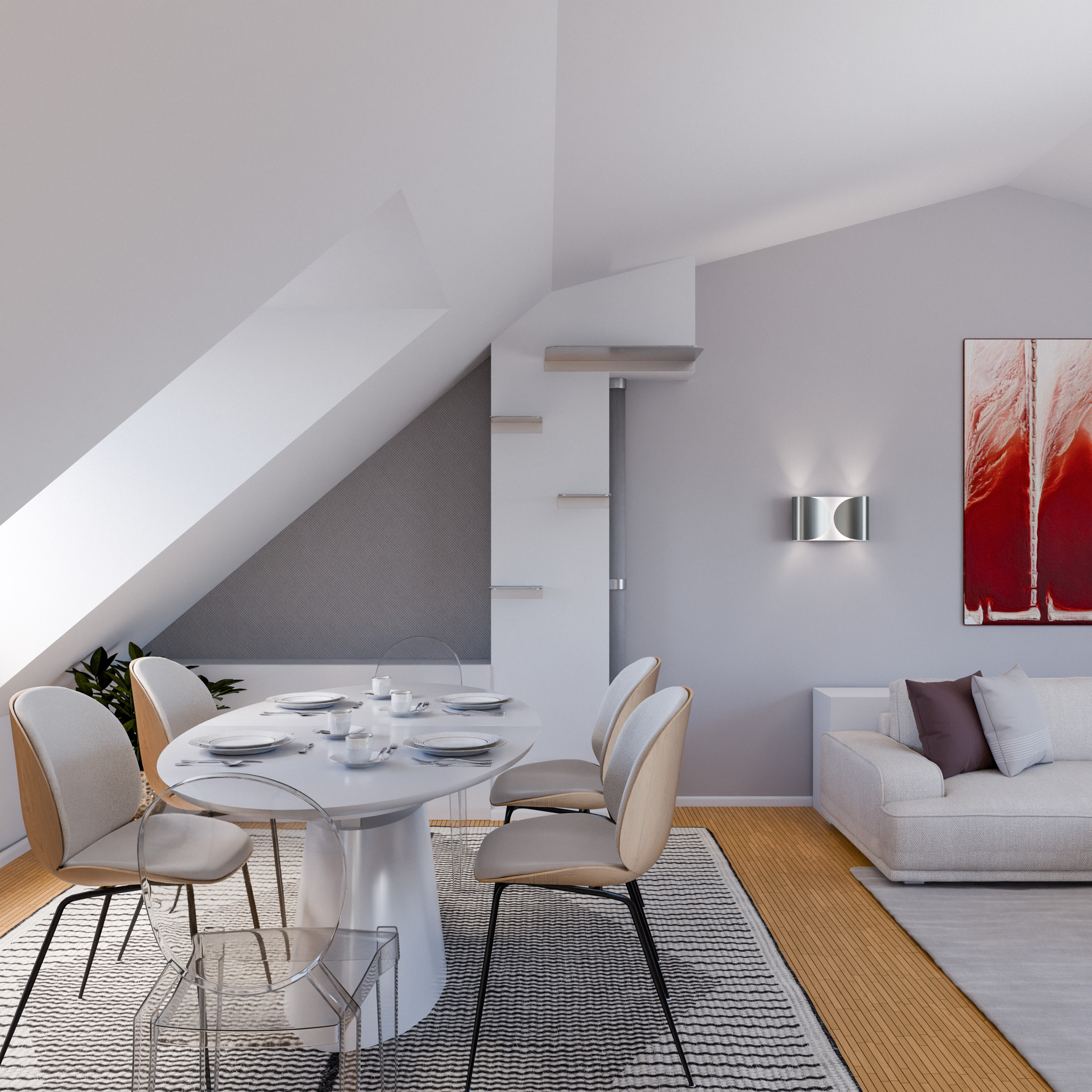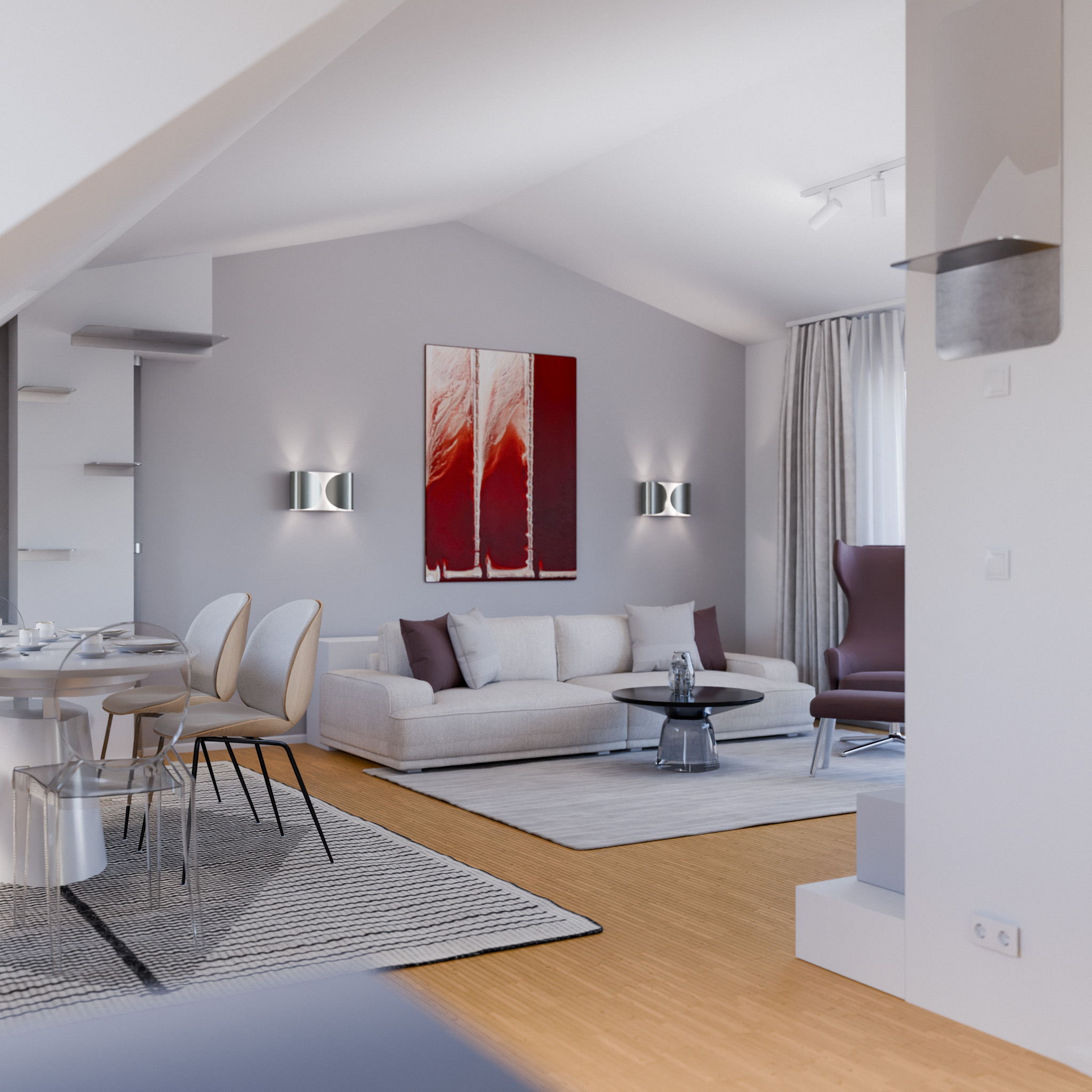 Dieser offen gestaltete Wohn-Essbereich einer Penthousewohnung in München strahlt eine elegante Leichtigkeit aus – geprägt von klaren Linien, sanften Farbnuancen und gezielt gesetzten Akzenten in tiefem Rot. Letztere setzen nicht nur optische Highlights, sondern schaffen auch eine stilvolle Verbindung zum vorhandenen Designersessel von Vitra sowie zu ausgewählten Lieblings-Dekostücken der Kunden.